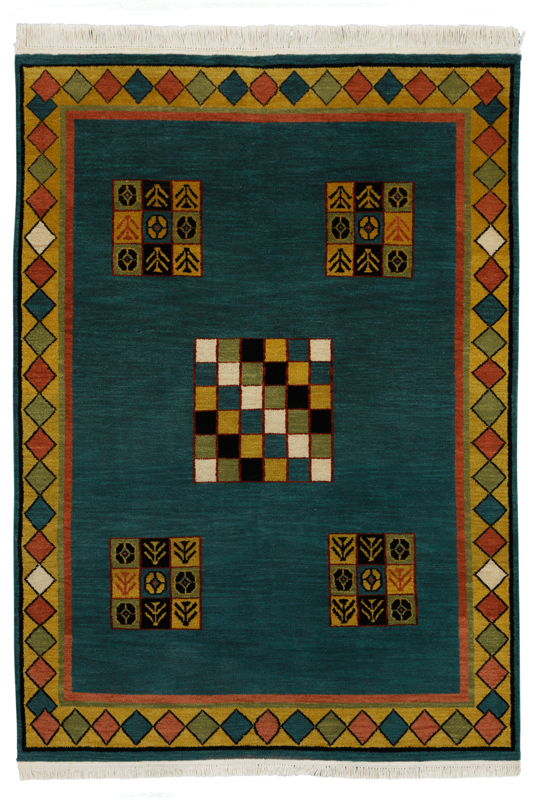 Rug weaving almost certainly does not extend back into India’s remote past; yet the Indus Valley is the site of one of the earliest major civilizations, which appears to have been centered in abandoned cities discovered near Harappa and Mohenjo-Daro, both in Pakistan. This culture flourished from about 2500 B.c. to 1500 B.C., and although the reason is not known precisely sits end roughly coincides with the beginning of the Aryan migrations. Subsequently a series of small Aryan kingdoms was established across the north, advancing slowly down the Gangetic plain. The sixth century B.C. witnessed the growth of new religions, as Gautama Buddha and Vardhamana Mahavira founded the movements’ culminating in Buddhism and Jainism.
