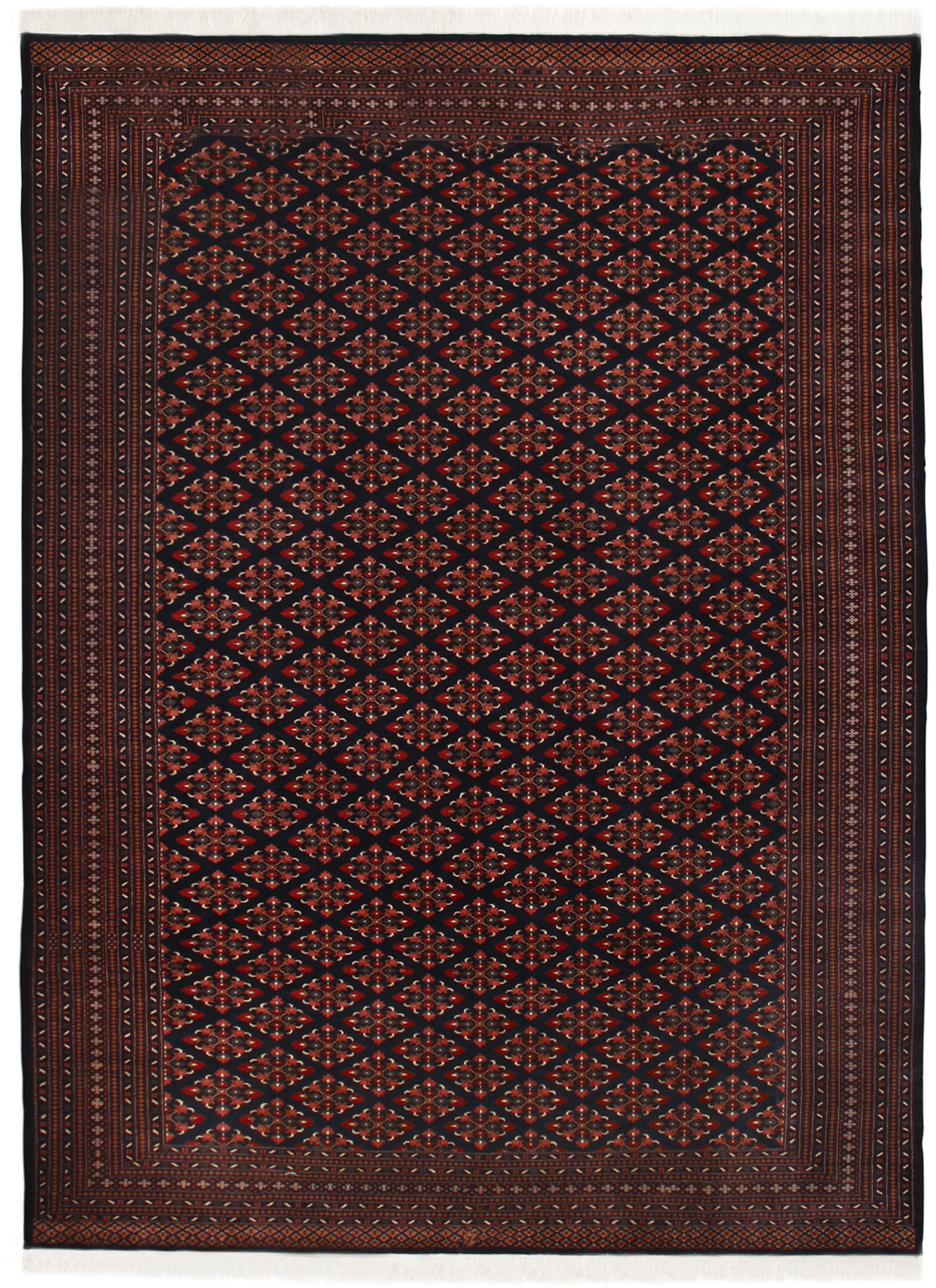 In the past Pakistan weavers only used the Sehna knots which produce a particular kind of surface. Now Ghiordes knots are being increasingly employed with Tajik, Turkoman, Uzbek and other tribes lending their own special touch and mood. New experiments have been made with warp and weft to make them more pliable. Apart from the traditional structure, wool on cotton, wool on wool and wool on silk are being used. All this has changed the basic structure of the carpet. The fabric has changed, a new texture has been achieved and surface quality has improved.